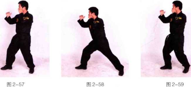 前推步,实践者从前位站姿开始,后边的脚用力蹬地,以产生地面反作用力推动整个 身体向前做冲击式的移动,在前脚与身体前撞的瞬间,后脚借惯性跟进。动作停止时,前 位站姿基本不变,如图2-57~图2-59所示。