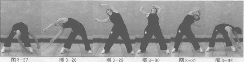 两脚并立,以两脚为轴左右转动,带动身体,髅部左右旋转,两臂随着身体的转动 甩动(图3-33?36)。