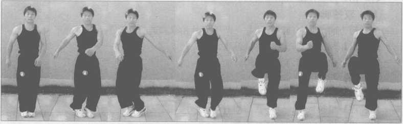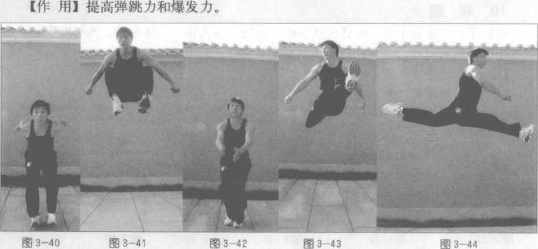 两脚开立,略小于肩,双臂由下向上带动身体向上跳起,两膝关节屈起尽量向胸前 贴,落地时以脚掌弹起(图3-40~41)。