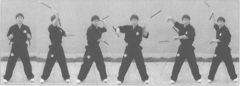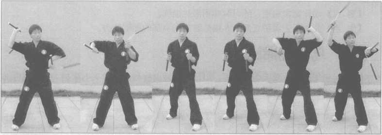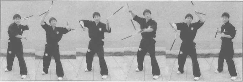 1 .夹棍势起,双手各持一棍,同时上撩借上臂反弹,右手棍向前斜劈,借左腰部反 弹反回右腰侧,借腋下反弹将棍撩起,左手继续做右手同样动作,左右手依次练习,收 棍时,夹于腋下(图4—307~315)。