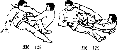 承上势,当我用右腿套拨套倒对方后,我立即坐起以左 手猛抓敌裆(图6—128),继而再以左右脚猛点攻之左右耳 门或后脑(图6—120)。敌必重伤焉。