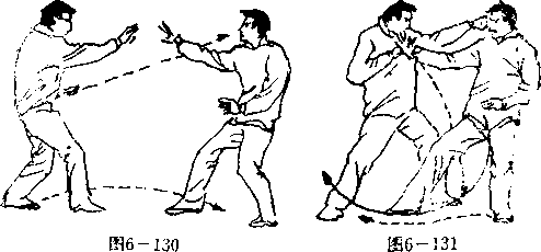 设想敌我双方右腿于前左腿于后拉开战局(图6—130 敌左足向我右足外侧抢位进步,并以左单插花拳击我右耳