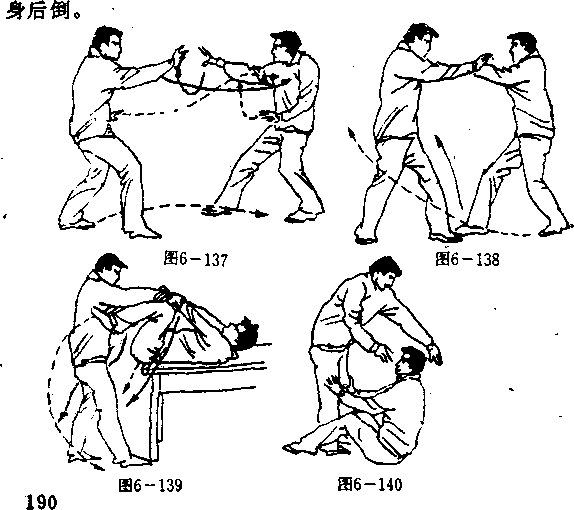 设想敌我双方右腿于前左腿于后拉开战局(图6—137)。 敌左足向我裆插进,双撞掌向我胸部击来,当敌双掌击 来时,我双手急从敌双臂内侧上穿,并翻手捋敌双腕,并向左 右分捋(图6—138),与此同时,双足蹬地跳起,以双足限 夹击敌之双肋(图6—139).敌被夹击必想撤躲闪,我双腿 急从敌双腿外侧下滑套,并坐卧于地,双小腿紧紧夹住敌之 双腿,而双手猛向敌双膝前推(图6—140).敌膝被推必伸