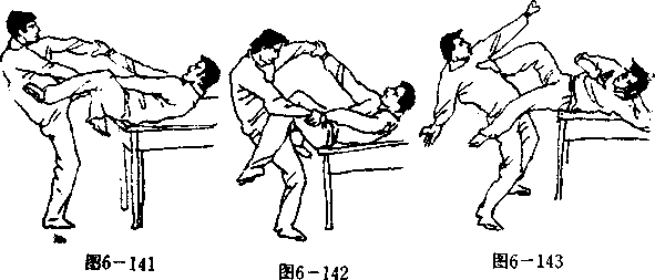 承上势,当我用玉带缠腰进击对方时,我双足跟夹击敌 双肋时,敌突然提膝上顶我裆(如敌提左膝。图6—141), 我身体在空中左翻滚,屈右膝里掩敌之左膝,以左小腿后侧 勾住敌之右小腿(图6—142),再以右足猛蹬敌之右大腿根 部。敌被蹬必向其右侧跌出。(图6—143)