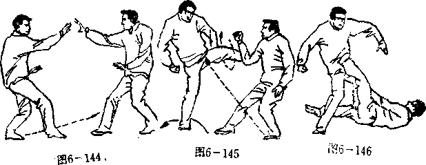 设想敌我双方右腿于前左瞄于后拉开战局(图6—144 ). 敌以左腿直踢我右18或裆部,当敌腿踢来时,我速下蹬以右 臂下外挂并缠抱敌之左腿(图6—145),与此同时,我右腾 速伸入敌档内,作右扁摔动作,以右胭后挂敌之右小腿,a 左足随卧身势上蹬敌小腹。敌被蹬必仰身后倒(图6—146)。