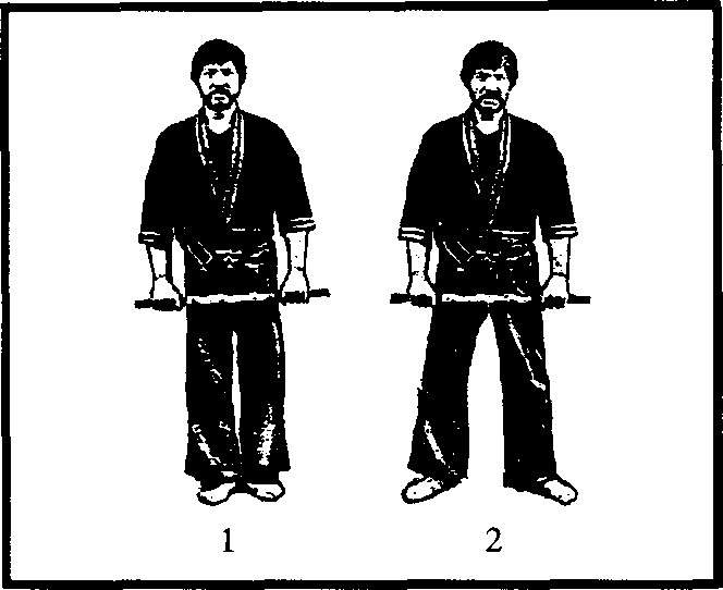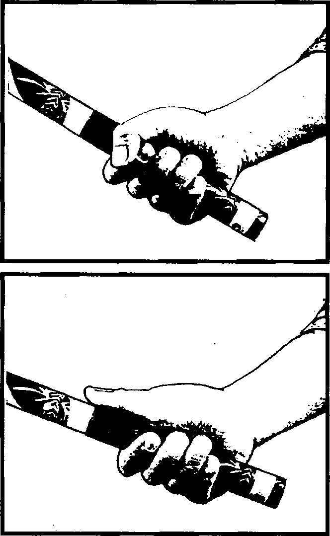 短棍的握法正确与否,直接关系到短棍技术的发挥,故此我 们应该掌握好正确的握法。我们手握短棍时,应抓牢,不使其在 手中摇动。现介绍两种短棍的握法: