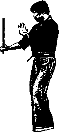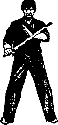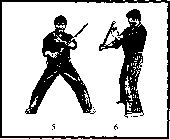 这种姿势是用于应付对方从正面直接攻击的姿势。双脚处于 相同的位置,此为一种非正式的准备姿势,两膝稍微弯曲,同时 用右手握棍(短棍与地面成45度角),左手在后做好防御的准 备。图3:侧面视图。图4:前面视图o