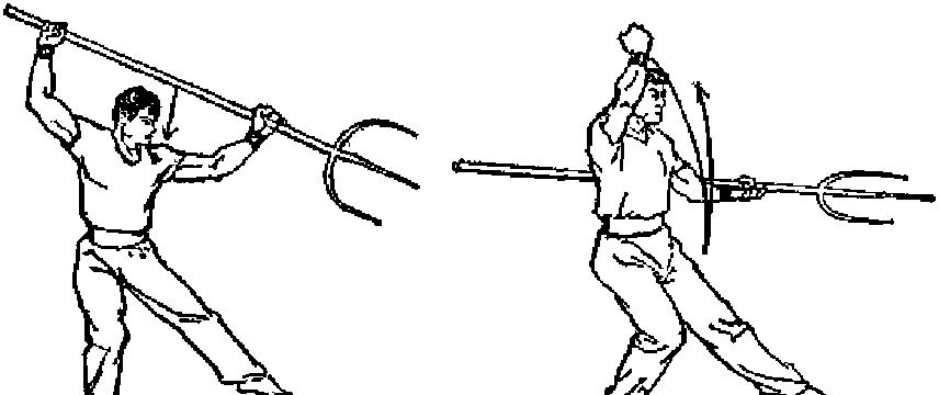 ② 上体右转*右手使跑尖由前向右后乎绕一周*随即左 脚向右前方上一步r右脚向后退一步,右手使饨尖继续由右 向后、向左经头部平绕一周,随即向后伸直,手心向下,使 钳把中段背于左肩上#同时左腿屈膝上提成右独立步。左臂 屈肘提至左胸前,肘尖向前。目视前方(图BU)0-