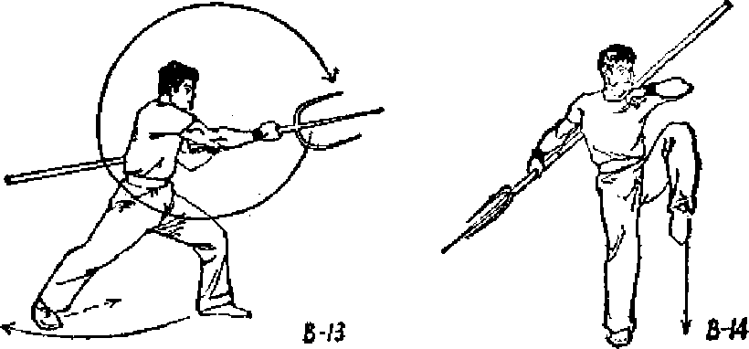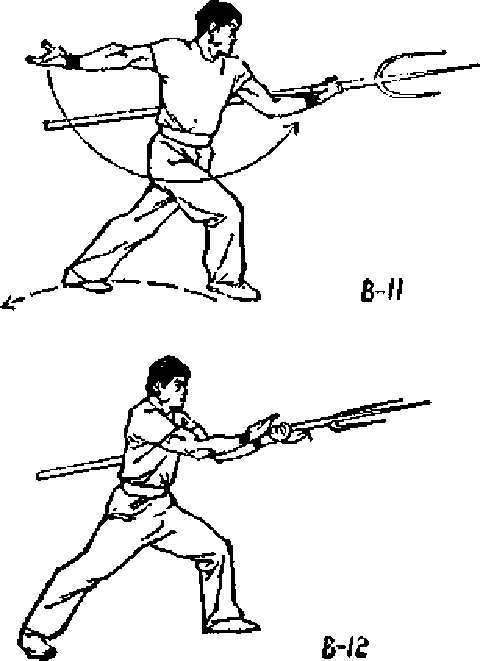 ② 右脚后退一 步成左弓步.同时 右手由后向下、向 前上撩*高与肩 平.掌心向内.目 视前方(图B12),