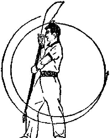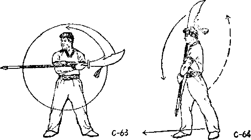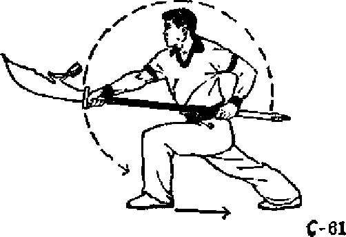 ① 左脚后退一步?同时左 手活握把向左肩上提起(手心 向下)*再向前、向右下绕弥 一周,与此同时,右手活握把 屈肘提向右肩上,使刀刃向 后、向前舞花《图CG2) o