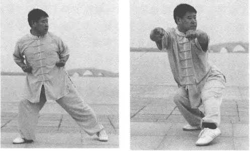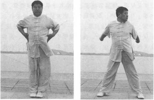 接上式。左腿向左跨出半步,全脚着地,略比肩宽,两腿伸直,同时,两手向上 提于腰间,头向左摆动,眼看左侧方,两手向后勾出。(图8-2、图8-3)
