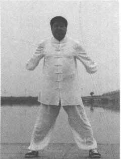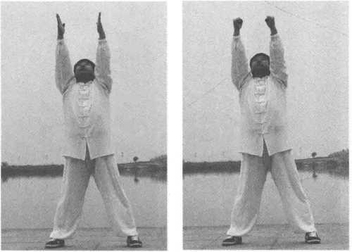 接上式。动作不停,两手变掌,由身体两侧向上举起,两臂伸直,当举到头顶时, 两掌心相对,再由掌变成拳,由上向下,手心向里,贴身下打,停留在腹前,拳眼相对, 同时,头向左转,目视左前方。(图3—13、图3-14、图3—15)