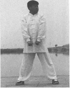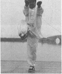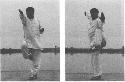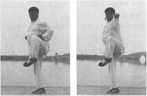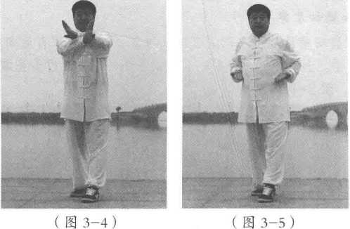 接上式。右腿向后落步,右腿直立站立,左腿提膝,两掌攥拳收于腰间,拳心向 上,目视前方口接上式。同时,两拳于腰间向两侧冲出,拳心向下,目视左拳拳面.(图 3-7,图 3—8)