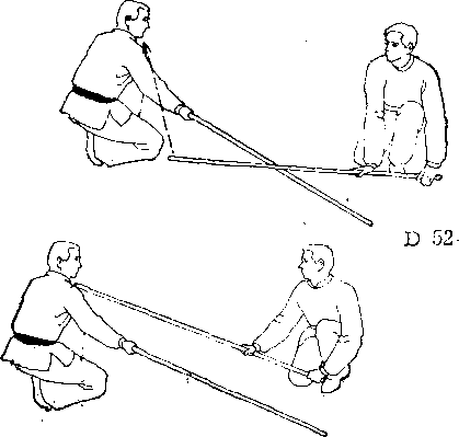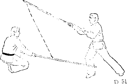 速向后方退一大步,左脚跟着后退并蹲低,同时,甲棍顺着 对方的棍向下沉低并向前扫来之势,紧粘其棍并向下压(图 D-52),压住乙的攻势后,甲迅速转棍向上,用猛虎出洞 的招式,以棍尖冲刺对方咽喉(图D-53) o