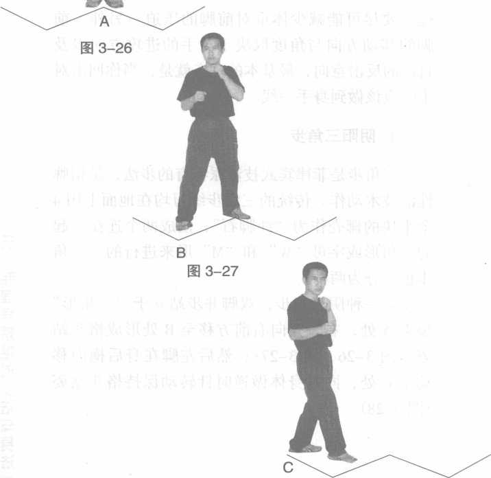 第一种阴三角步,双脚并步站立于“三角形” 顶点A处,右脚先向右前方移至B处形成格斗站 姿(图3-26、图3-27);然后左脚在身后横向移 动至C处,同时身体做逆时针转动保持格斗站姿 (图 3-28)o