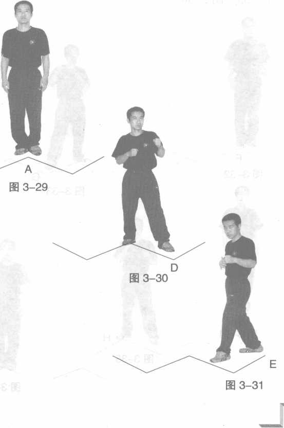 右侧阴三角步同左侧,即双脚并步站于“三角形” 顶点A处,左脚先向左前方移至D处形成格斗站姿 (图3-29、图3-30);然后右脚在身后横向移动至E 处,同时身体做顺时针转动保持格斗站姿。(图3-31)