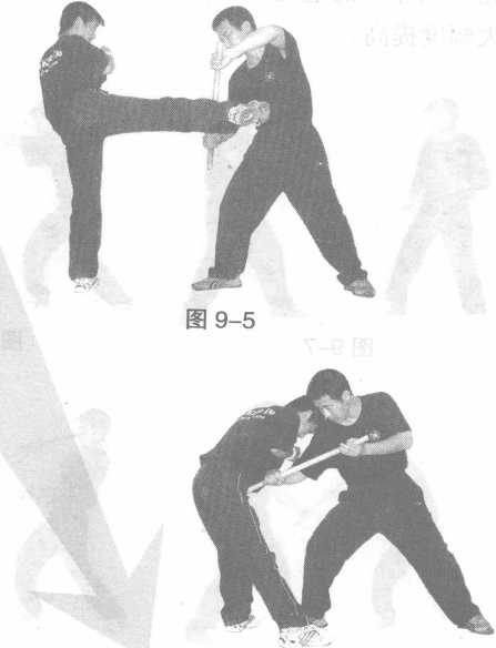 短棍对抗徒手攻击的自卫。可以用短棍直接迎击对 手用于进攻的拳、脚,伤其肢体后再做连续攻击,直到 对手完全丧失攻击能力为止。“以有余欺不足”是短棍 防卫徒手攻击的基本战略思想。图9-1—图9-3与图 9—4—图9-6分别演示了用短棍对拳、脚攻击的防卫。