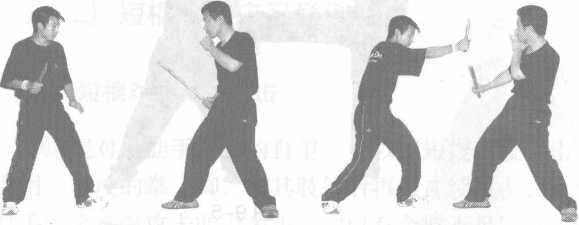 从本质上讲刀剑与短棍的技术是相似的, 但是对于二者攻击的防卫却稍有差异。当对抗 钝质武器攻击时,可以直接用短棍或活手与对 手的器械相接触,但是如果对手用刀剑类的利 器,那么情形就不同了,因为短棍或活手与对 手刀剑利刃接触时就会出现损伤现象,所以从 这个层面上说,短棍对抗刀剑要比短棍对抗短 棍难度要大得多。