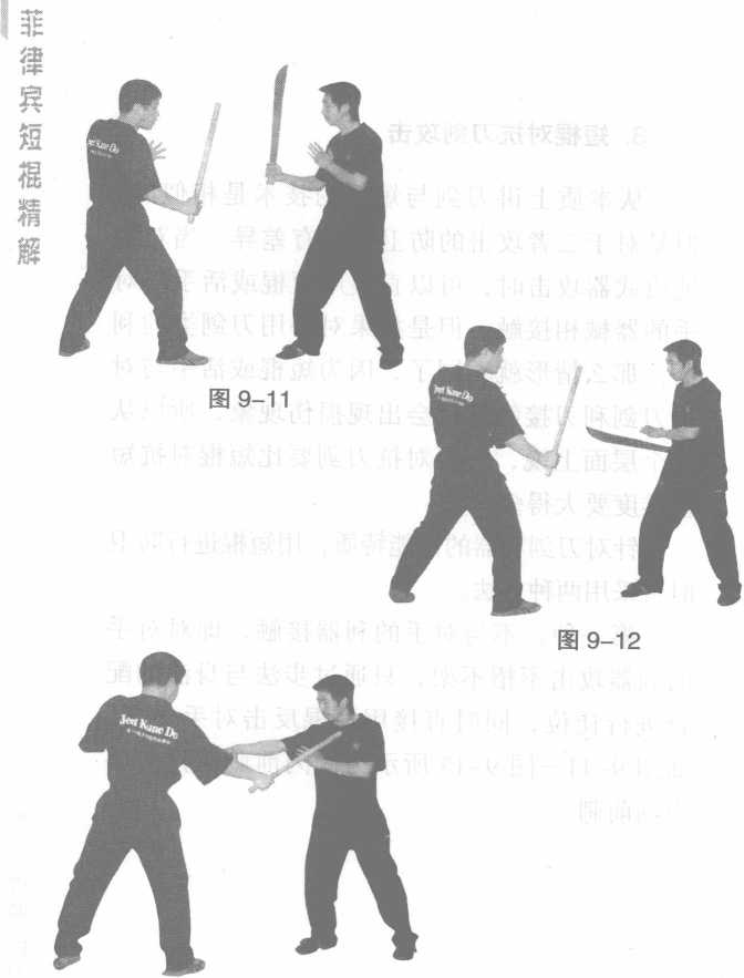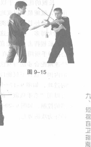 短刀(匕首)小巧灵活,便于携带、杀伤力强, 是歹徒最常用的行凶武器之一。面对手持短刀的对手 时,首先应该避免与其做近身对抗,以此限制其短刀 优势的发挥;其次在远距离格斗范围上引诱对手出刀, 随即直接用短棍攻杀其前锋手,近取之下使对手中招, 如图9-7—图9-10所示。一旦对手失去武器,就如同 无“爪牙”的老虎,而自己武器在手,安全系数就会 大幅度提高。