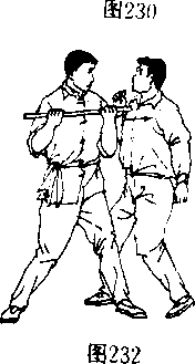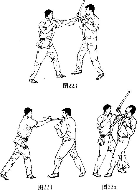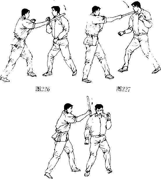 (D施用短棍顶端向前戳击。(图223) (2)施用短棍前端向前抽击。(图224) (3)施用短棍末端向前撞击。(图225)(四)锁骨部攻击方法(D施用短棍前端由上向下劈打。(图226)(2)施用短棍前端由上斜线向下抡打。(图227)(3)施用短棍末端由上向下砸击。(图228)? 102 ?图228(五)胸部攻击方法(1)施用短棍前端向前抽击。(图229)(2)施用短棍顶端向前戳击。(图230)(3)施用短棍末端由左向右或由右向左撞击。(图231)(4)旅用短棍末端向前顶击。(图232)
