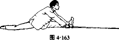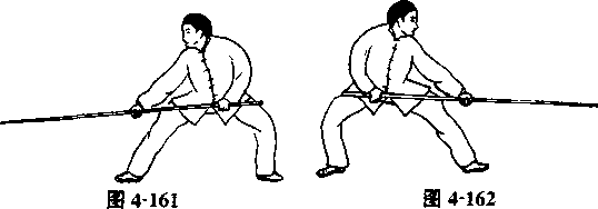两手正握棍把段,使棍横向成水平,高与腰平齐,然后两 手用力朝把端方向拉(图4-161)。
