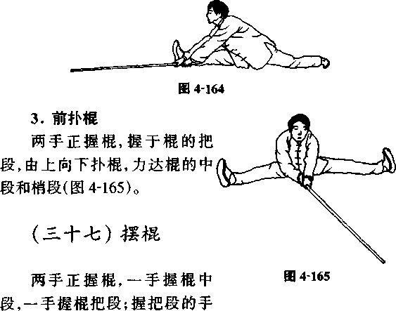 两手正握棍,虎口朝棍梢方向;左手握棍的把段,右手握 于棍的中段。将棍由上向下扑,边扑棍,边将右手沿棍向把段 的手滑动;棍着地时,两手挨近,使棍身贴向地面(图4-164) 0