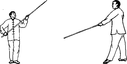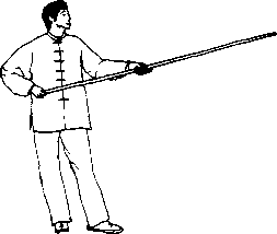 两手正握棍,左手握棍中段,右手握棍把段,虎口朝棍梢 方向。右手握棍把靠紧身体并以其为支点,使棍成水平,左手 将棍上下来回摆动,力达棍梢段(图4-169) o
