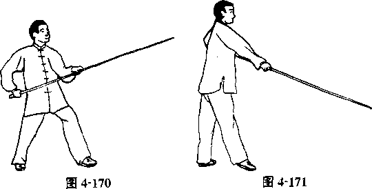 两手正握棍,左手握棍中 段,右手握棍把段,虎口朝棍梢 方向。右手握棍把靠紧身体并 以其为支点,使棍梢斜向上方, 左手将棍上下来回摆动,力达棍 梢段(图4-170)。