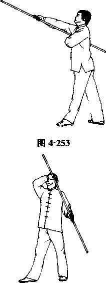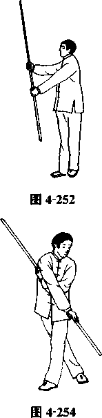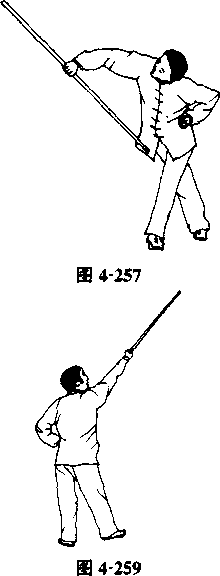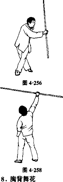 周,使棍顺势不停顿地翻转一周;再左右各做一个立圆舞花。 棍要贴近身体,但不准碰身,棍端不得触地(图4-256?图4- 260 )o