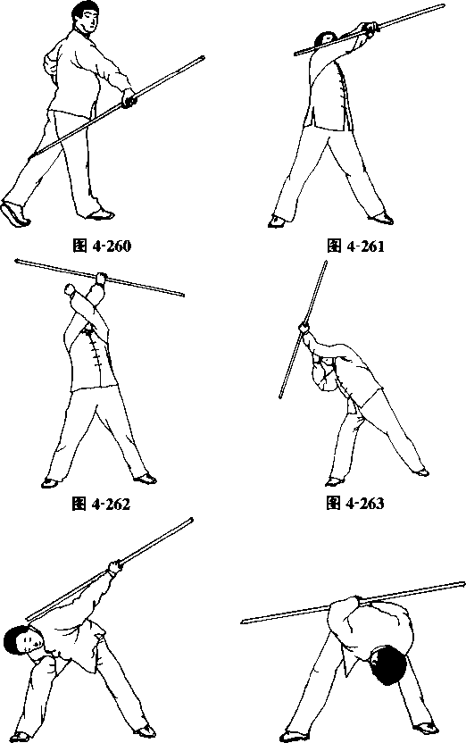 右手握棍中段,使棍横向与地面平行。棍端由前向左、向 后、向右平转一横圆,做时要后倒挺胸仰头;然后将棍交到左 手,身体前俯,棍在背后不停顿地转一横圈。如此可连续进 行。动作速度要掌握好,棍身要水平旋转,身体随棍法前俯后 仰(图 4-261~图4-266)。