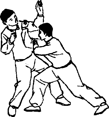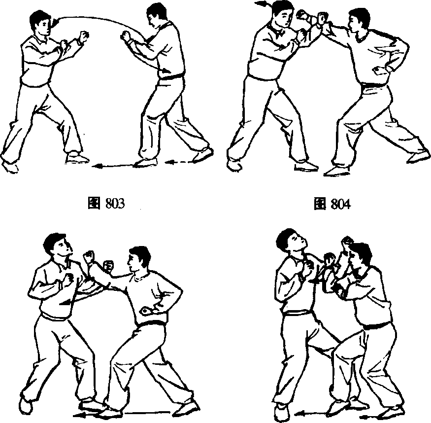 乙向后仰身躲开甲右拳。(图805)图807图807图807图807甲拳打空后向左后弧形落回胸前竖小臂,拳向里掩成拳 心向内,同时向左转腰带动右脚落于左脚内侧虚点成丁步, 双腿微屈。(图806)接着甲右脚向前进步落于乙两脚间,重心前移的同时, 左手掌护在肘部借移重心之力使肘向前顶出,力达肘前沿, 击乙胸腹部,可将乙击倒。(图807)〔要点〕掩肘的关键是外旋小臂使小臂与大臂成直角立 于胸前,再借前移重心之力向前撞出。