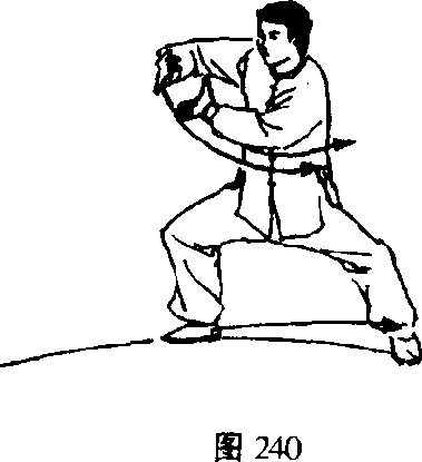 上动不停,上身挺身,右手继续内旋手臂向左压下成双 臂交叉于胸前,右手掌心向左,掌指向体后,双膝微屈,目 视体左侧。(图238)