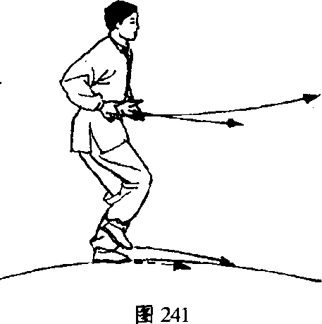 上动不停,向左转体成体右侧向圆内的同时,双掌继续 向内经腰前向左,成掌心向内,掌指向左,同时右腿靠于左 腿内侧不落地,目视双掌。(图241)