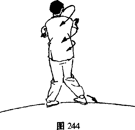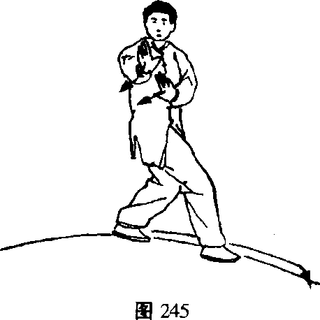 侧,双手内旋手臂,塌腕的同时,双掌向圆心推出并下塌成 双掌正对圆心,双掌虎口撑圆,四指微分竖直,右掌高与臂 齐,左掌掌型同右掌,置于右肘内下侧,食指距右肘尖一 寸,掌心向圆心,目由右掌虎口看出。(图245)