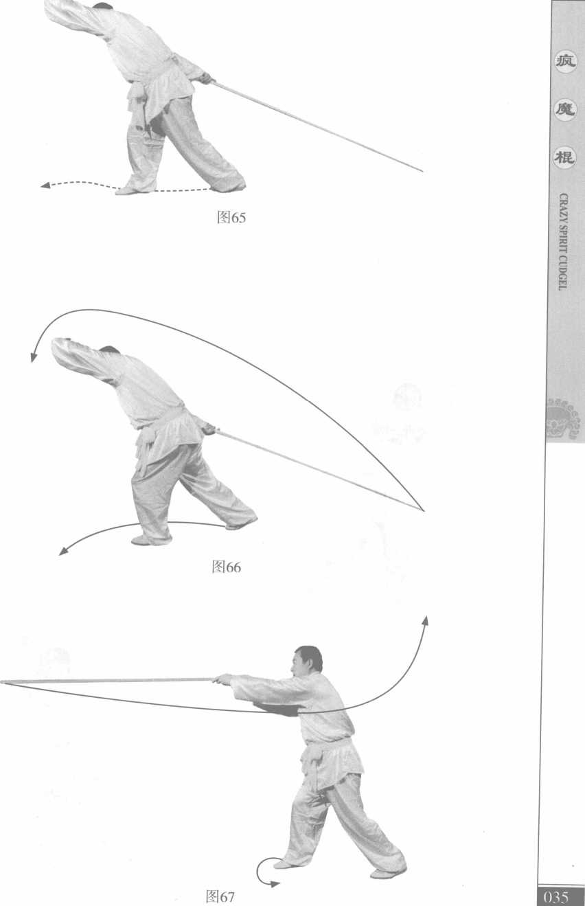 1 .右脚落步,棍尖触地,棍拖身后,目视棍梢,前上五步,左脚在 前。(图65、图66)