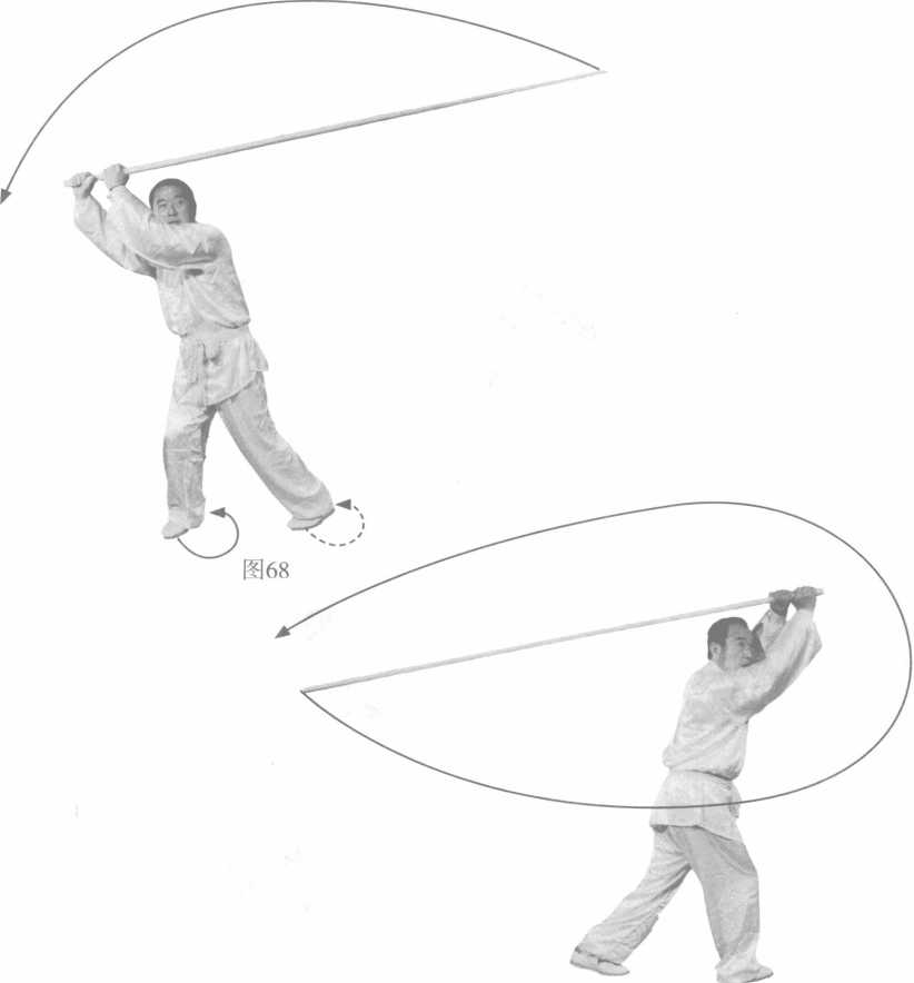 2 .右脚上步,右手持棍,向前平抡,左手接棍,目视棍梢。(图67)