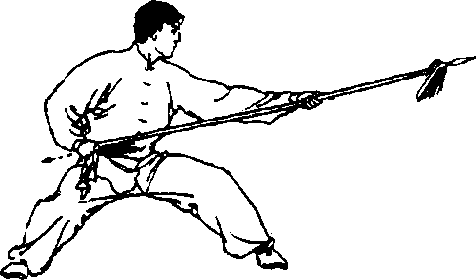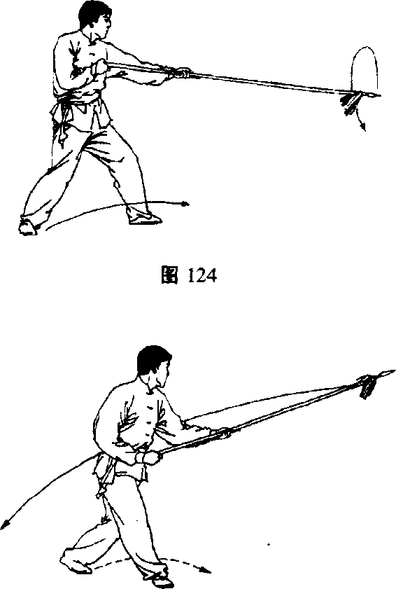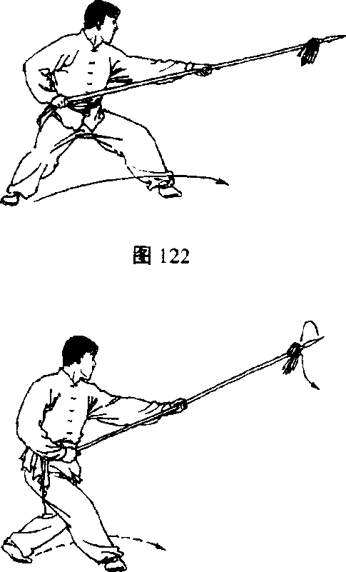 2. 接上动。右脚向前上步,脚尖外展,做逆时针缠枪(图 123);左脚与右脚交替上步,连续缠枪,共三周(图124、 125)。