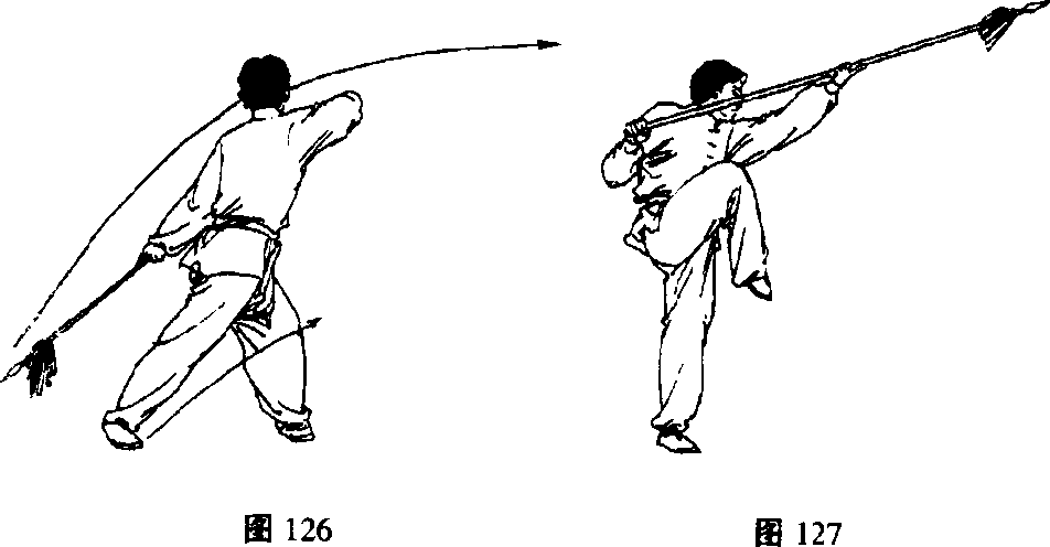 3. 接上动。左脚上一大步,向左后下方做拦枪(图126)。