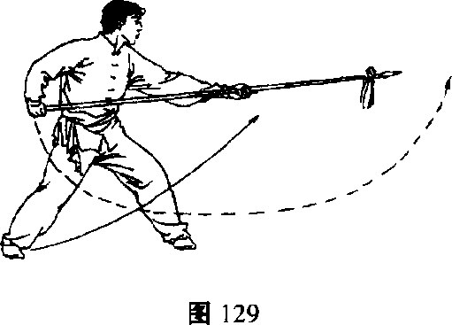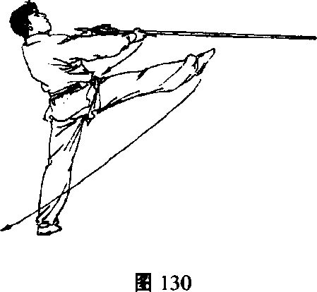 枪身前部,右手使枪把由下向前撩出?混握至左手前(使枪把 倒头),同时上体后仰,右脚前踢(图130) o