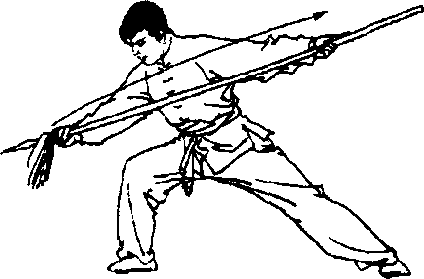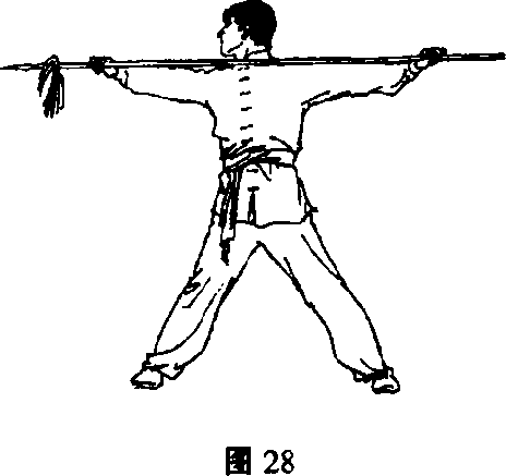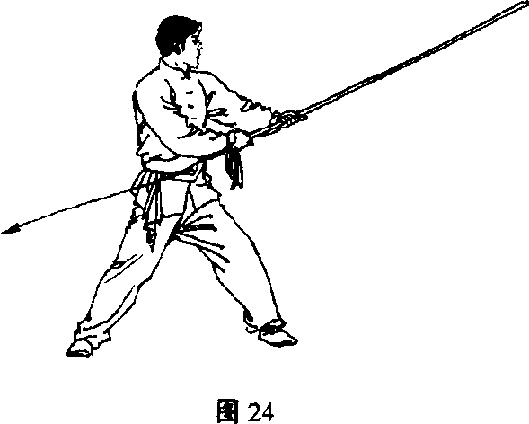 1. 两脚立开,阴把握枪,右手近于枪缨,左手握于枪杆前 段(图24)。