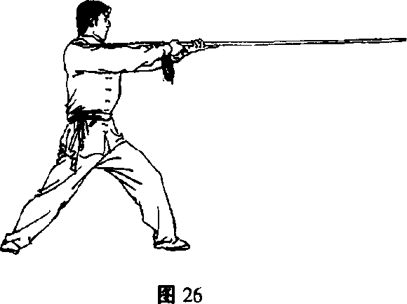 5. 上动不停。右手向右抽枪;左手松握滑把,使枪头穿过 喉前向右侧平刺(图28)。