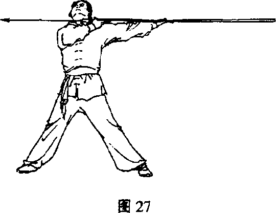 4. 头部和上体后仰,右手转换为阳手握近枪缨处(图 27) o