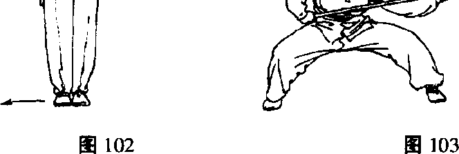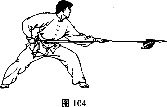 2. 接上动。右脚向右移半步成半马步,上体左转90。,拦 枪(图103);重心前移,拿枪(图104) ;±体左转,成左弓步,扎 枪(图105) o