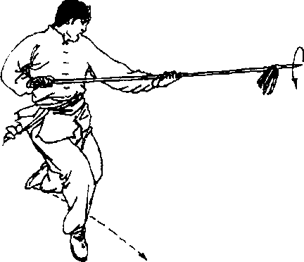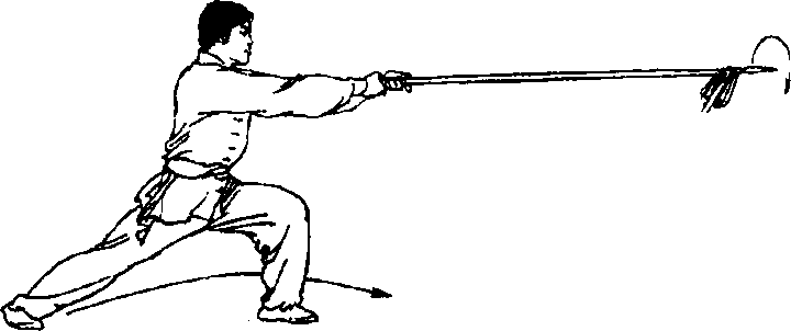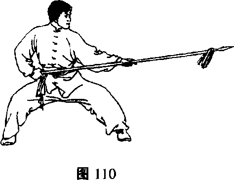 4. 接上动。左脚蹬地,右腿提膝跳起,拦枪(图109);两脚 依次落地成半马步,拿枪(图110);上体左转,左弓步扎枪(图 111)。