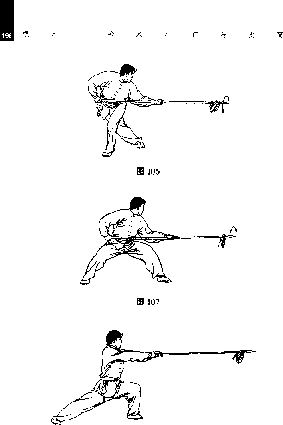 3. 接上动。身体重心上移,同时右脚向左倒插一步,拦拿 (图106);左脚向左一步,成半马步,拿枪(图107) ;±体左转, 左弓步扎枪(图108)。