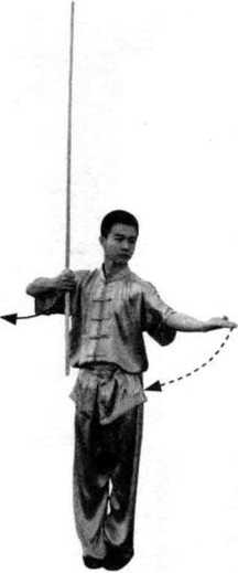 两脚并步直立;右臂 屈肘,右手握棍身把段至 身体右侧,棍身垂直;左 手五指并拢贴靠于左腿外 侧;目视前方。(图1)