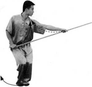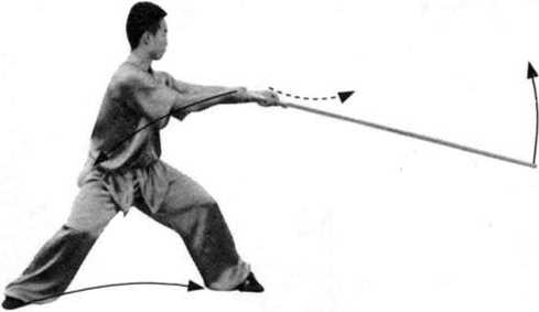 接上势,右脚向左脚并步震踏;同时,右手握 棍上提,随即翘腕下沉;左手先后滑再向前滑握, 使棍梢向上崩起;目视棍梢。(图139、图140)