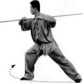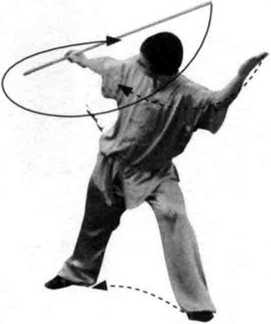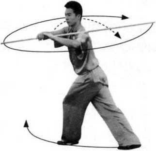 接上势,右脚向右后方上步,左脚向右脚外侧 扣步;身体右后转360。,随即右脚向右后撤步;同 时,两手滑握棍把段于左肩侧,随即左手离棍摆于 左前上方,略高于肩;右手握棍随转体向右平抡一 周;目视棍身。(图141—图143)