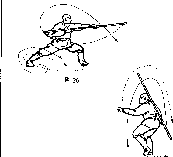 右脚后退一步,体右转90度,使两腿成马步,棍由右向左下方打(图24);体再右转360度,棍由左向右打(图25 )。138棍图2717. 大破元门然后起身,体向右转90度,上左步成左弓步, 双手托棒向前穿,目视棍端(图26)。18. 白猿归穴抡棍,转圈,倒步背棍,束身归洞(图27)。139少林传玫我术普及敬材J收势左脚后退一步,体左转,左手接棍,收右脚与 左脚成并步,左棍下端落地,笔直树立,右手抱 拳,身挺直,目视前方(见图1)。140J _ V