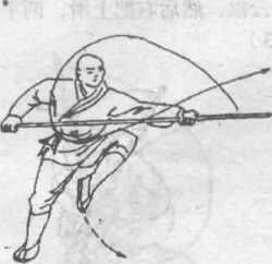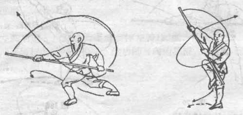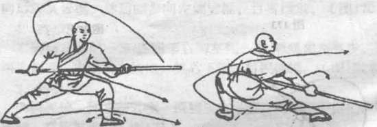 两脚用地,体右转90度,左腿向前提膝,同时两手握棍随身势向 右撩打,然后两手滑把托棍砌戳棍梢向前,目视棍梢。(图179)